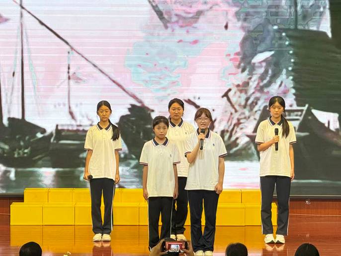 活动现场,八年级各 班依次登台展演。各班学子满怀热情,用铿锵语调传递经典力量:8.4班以《水调歌头》为引,缓缓道出苏轼“但愿人长久,千里共婵娟”的团圆祝愿;8.5班诵读《七律・长征》,让“红军不怕远征难”的豪迈气魄重现在众人眼前;8.2班通过《如果没有苏轼》,带师生一同走进北宋文人的精神世界;8.6班演绎《满江红・写怀》,借“怒发冲冠”的激昂气势诠释家国担当;8.8班以《红船从南湖起航》讲述中华民族的奋斗征程;8.7班凭《月光下的中国》勾勒新时代神州大地的璀璨图景;8.3班用《中秋的月亮》诉说月光中蕴藏的思念与祝福;8.1班则以《黄河颂》展现母亲河的磅礴力量,彰显中华民族的不屈精神。