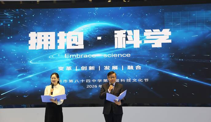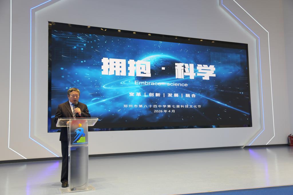 芳菲四月,春意盎然。2026年4月24日上午,郑州市第八十四中学第七屆科技文化节在学校科创中心盛大开幕。本屆科技文化节以“拥抱·科学”为主题,围绕科普启蒙、科创实践、竞技比拼、成果展示四大板块,历时五天(4月24日至4月28日),汇聚全校师生的智慧与热情,融合语文、英语、数学、物理、化学、生物、历史、地理、道德与法治、美术、信息科技等多学科,打造了一场跨学科、沉浸式、互动式的全学科融合科技体验盛会。