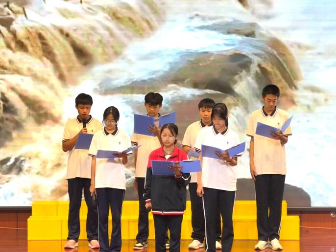 活动现场,八年级各 班依次登台展演。各班学子满怀热情,用铿锵语调传递经典力量:8.4班以《水调歌头》为引,缓缓道出苏轼“但愿人长久,千里共婵娟”的团圆祝愿;8.5班诵读《七律・长征》,让“红军不怕远征难”的豪迈气魄重现在众人眼前;8.2班通过《如果没有苏轼》,带师生一同走进北宋文人的精神世界;8.6班演绎《满江红・写怀》,借“怒发冲冠”的激昂气势诠释家国担当;8.8班以《红船从南湖起航》讲述中华民族的奋斗征程;8.7班凭《月光下的中国》勾勒新时代神州大地的璀璨图景;8.3班用《中秋的月亮》诉说月光中蕴藏的思念与祝福;8.1班则以《黄河颂》展现母亲河的磅礴力量,彰显中华民族的不屈精神。