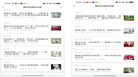 为落实大语文教育理念,厚植学生文化底蕴,提升语文核心素养,语文组沈慧老师通过微信公众号“惠风和畅的花园”,面向七、八、九年级开展系列经典阅读校本课程活动,以线上阅读、深度赏析、方法指导为抓手,实现传统文化浸润与应试能力提升双向赋能,成效显著。